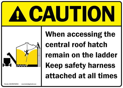 ANSI CAUTION When accessing the central roof hatch remain on the ladder Sign with Symbol