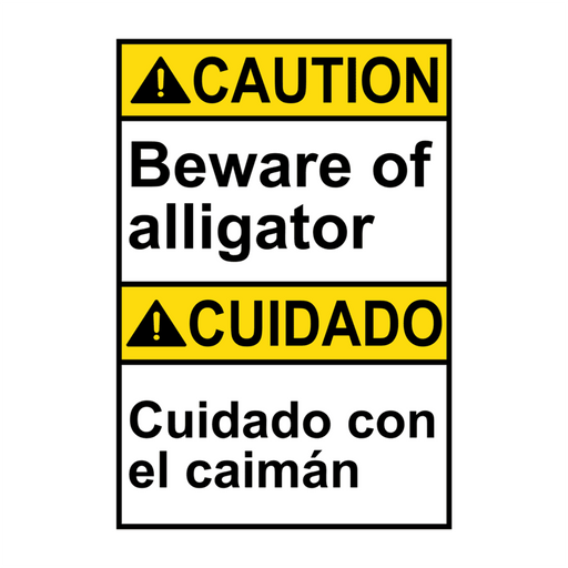English + Spanish ANSI CAUTION Beware Of Alligator Sign