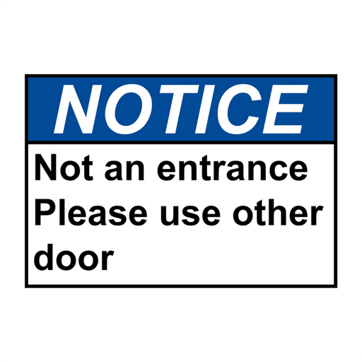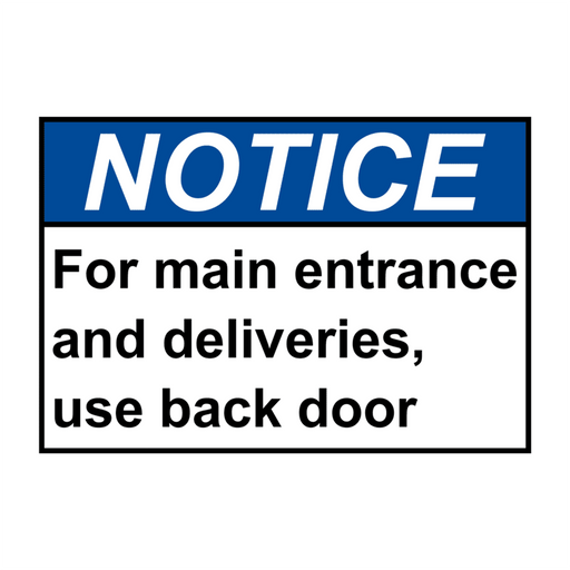 ANSI NOTICE For main entrance and deliveries, use back door Sign